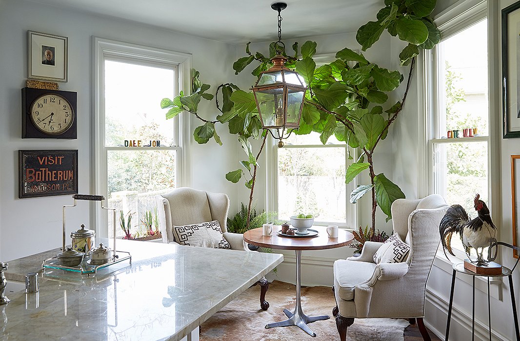 A window nook allows enough light for a pair of fig trees, under which Jon has his morning coffee and schedules his day. The copper lantern is yet another touch that brings the outside world in. “I sit here and I get centered,” Jon notes. “Looking at the trees blow outside, the sunlight pouring through, I remember what really matters.”