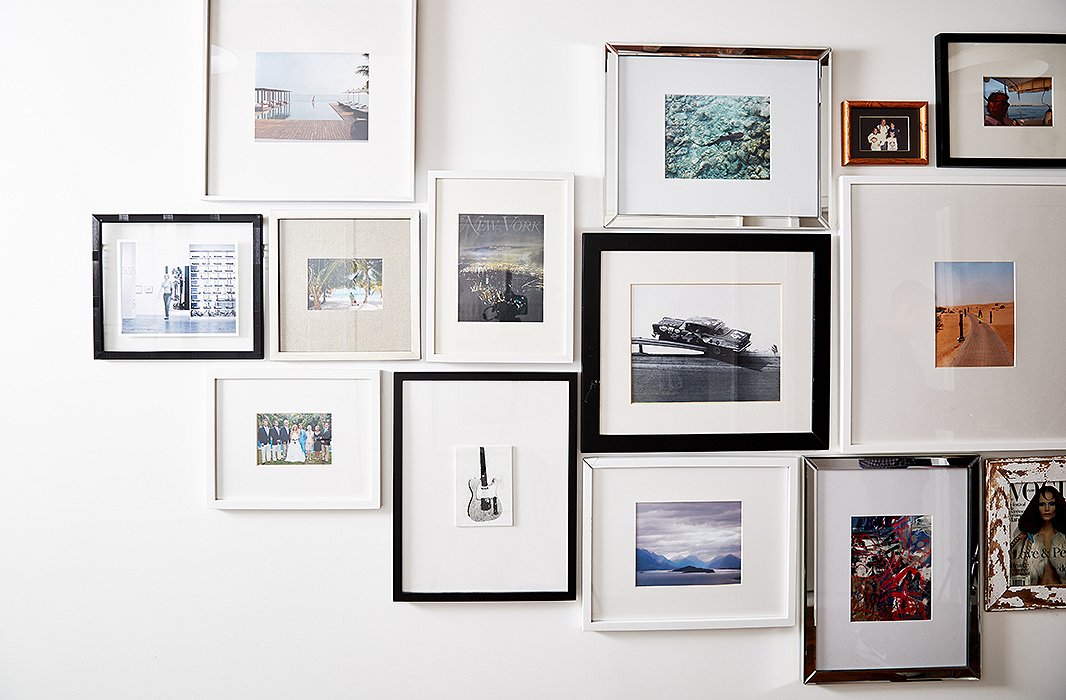 The gallery wall in the couple’s master bedroom showcases photographs from their travels as well as special personal moments.