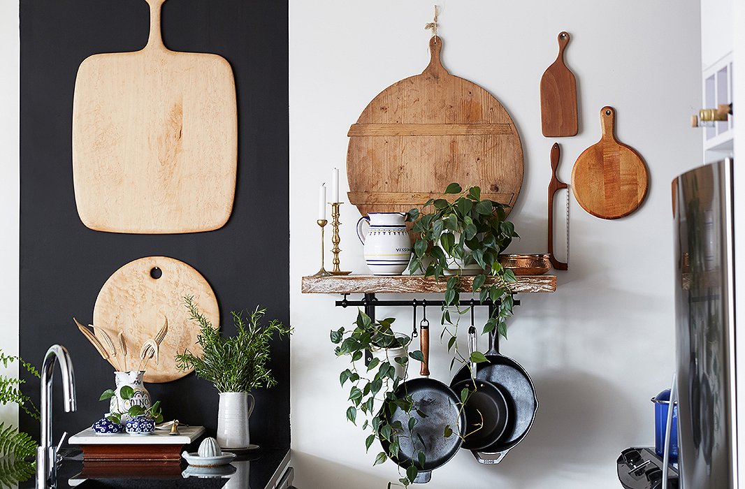 No need to stow away all your kitchen accessories and cookware. Show them off in a big way. A rack for pots and pans adds modern chef-grade appeal, while vintage cheese boards arranged as a gallery wall play up their organic beauty. And don’t underestimate trays as sleek and practical holding spots that can corral bottles, spices, and utensils… and transform these cooking staples into a fetching vignette.