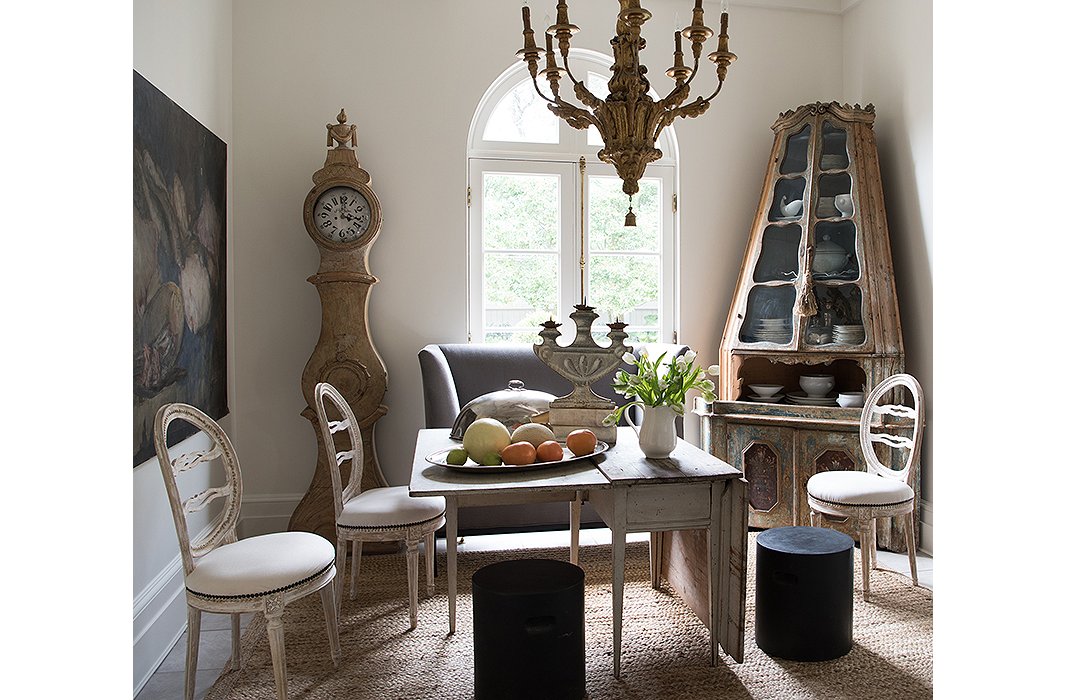 An 18th-century Venetian corner cabinet, a 19th-century Belgian still life, and a Swedish drop-leaf table make the breakfast room feel as if it’s been lifted out of an earlier century—yet Tara has balanced the pieces with dining room chairs and a gray banquette from Tara Shaw Maison.